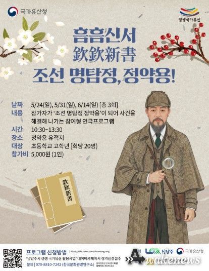 어웨이크뉴스 오경하 기자 | 남양주시는 오는 5월 24일과 31일, 6월 14일 정약용 유적지에서 초등학교 고학년을 대상으로 참여형 연극 프로그램 ‘흠흠신서: 조선 명탐정, 정약용!’ 참가자를 모집한다고 밝혔다.
