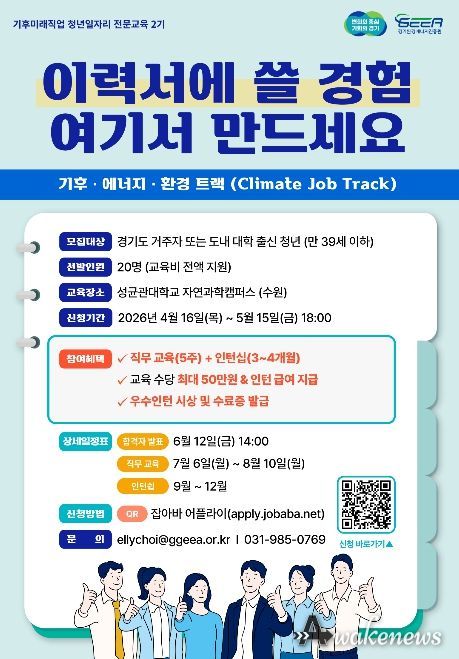 어웨이크뉴스 오경하 기자 | 경기도와 경기환경에너지진흥원은 도내 기후·에너지·환경 분야 기업 취업을 희망하는 청년을 대상으로 ‘기후미래직업 청년일자리 전문과정’에 참여할 교육생 20명을 5월 15일까지 모집한다.