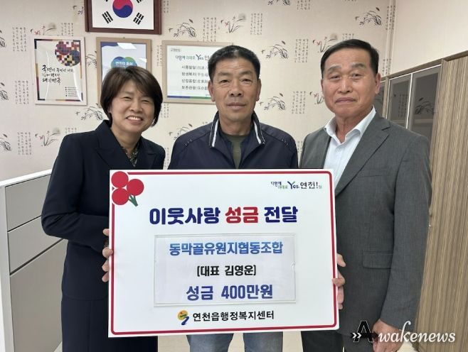 어웨이크뉴스 오경하 기자 | 동막골유원지협동조합은 지난 28일 오후 4시 연천읍행정복지센터 읍장실에서 이웃돕기 후원 성금 400만 원을 기탁했다.