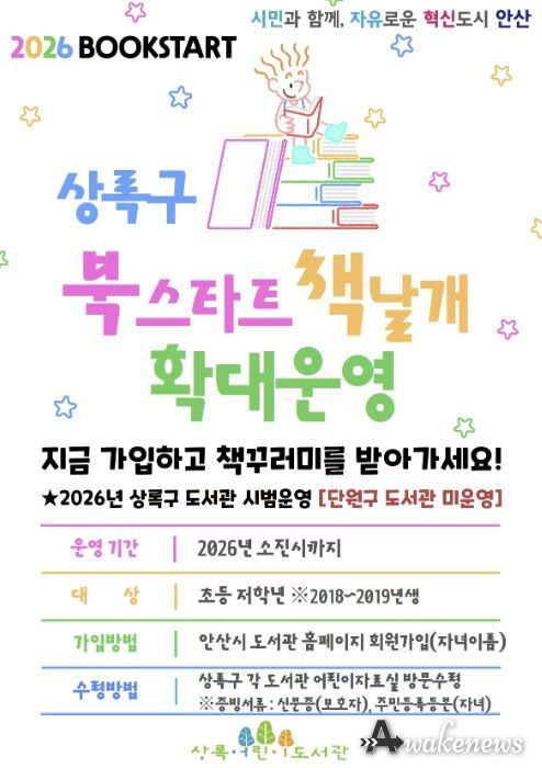 어웨이크뉴스 오경하 기자 | 안산시는 상록구 소재 도서관에서 운영 중인 ‘북스타트 사업’ 대상을 기존 영유아에서 초등학교 저학년 학생까지로 확대한다고 30일 밝혔다.