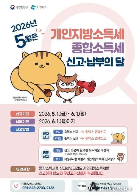 어웨이크뉴스 오경하 기자 | 의정부시는 5월 개인지방소득세 및 종합소득세 확정신고 기간을 맞아, 5월 6일부터 6월 1일까지 시청 본관 세무민원실에 신고 도움창구를 운영한다.