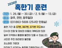 어웨이크뉴스 오경하 기자 | 육군 제25보병사단이 2026년 1월 26일부터 30일까지 파주시ㆍ양주시 일대에서, 2026년 2월 9일부터 13일까지 파주시ㆍ양주시ㆍ연천군 일대에서 각 1주간 혹한기 훈련을 실시한다. 이번 훈련은 안전이 확보된 가운데 실제 훈련을 통한 동계 작전계획 시행능력을 구비하고, 전·평시 작전수행능력 숙달 및 군사대비태세를 완비하는 데 중점을 두고 진행된다. 부대 관계자는 훈련 기간 중 37번·367번·371번 국도에서 다수의 병력과 장비, 차량이 이동하게 되며 훈련 상황에 따라 부분적인 교통통제 등이 실시되어 주민들의 이해와 적극적인 협조를 당부했다. 사단은 훈련기간 중 주민불편을 최소화하고, 부대 안전사고를 예방하기 위해 안전통제반을 운영할 계획이다.