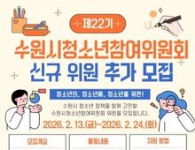 어웨이크뉴스 오경하 기자 | 수원시청소년청년재단(이사장 최종진)은 수원시 청소년의 정책 참여 확대와 권익 증진을 위해 '제22기 수원시청소년참여위원회' 위원을 추가 모집한다고 밝혔다. 수원시청소년참여위원회는 청소년기본법5조의2(청소년자치권의 확대)에 따라 청소년이 직접 정책 제안과 의견 개진에 참여하며 청소년 정책의 실효성을 높이기 위해 운영되는 공식 참여기구이다. 이번 추가 모집은 수원시에 거주하는 9세부터 24세까지의 청소년을 대상으로 하며 총 20명 내외를 선발할 예정이다. 활동 기간은 2026년 3월부터 12월까지이며 주요 활동 내용은 △수원시 청소년 정책 제안‧발굴 및 자문 △정책 관련 전문교육 참여 △청소년축제 기획 및 운영 △경기도 청소년참여위원회 및 관내 참여기구 교류 활동 등이다. 참여위원회 위원에게는 수원시장 명의의 위촉장이 수여되며 활동에 따라 봉사시간도 부여된다. 모집 기간은 2026년 2월 13일부터 2월 24일까지이며 신청은 재단 홈페이지 또는 수원시청소년청년재단 경영지원실로 문의하면 된다.