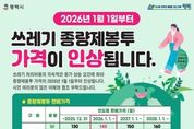 어웨이크뉴스 오경하 기자 | 평택시는 2026년 1월 1일부터 쓰레기 종량제 봉투 가격을 3개년도에 걸쳐 인상한다. 그동안 평택시는 인구증가, 물가상승, 생활 쓰레기 수집 운반 처리비용 증가에도 불구하고 2006년 이후 종량제봉투 가격을 동결해 왔다. 시 관계자는 “현재 평택시의 종량제 가격은 경기도 31개 시군 가운데 최하위 수준이며, 청소예산 재정자립도와 주민부담률이 낮아 가격 인상은 불가피하다”고 밝혔다. 따라서, 대표적으로 일반용 종량제봉투 20리터는 현재 500원에서 110원 인상된 610원으로, 음식물 전용 봉투 1.5리터는 현재 40원에서 20원이 인상된 60원으로, 공동주택에 설치된 음식물종량제기기(RFID)는 1㎏ 단위로 현재 48원에서 12원 인상된 60원으로, 경기도 내 31개 시군 평균 가격을 반영하여 인상안을 마련했다. 다만, 서민경제의 어려움과 시민부담을 고려하여 가격 인상은 3개년도에 걸쳐 단계적으로 시행할 예정으로, 시 관계자는 “종량제봉투 가격 인상에 대한 시민 여러분의 많은 이해와 협조를 부탁드린다”며 “앞으로도 쾌적하고 청결한 도시환경 조성은 물론 질 높은 청소행정
