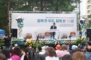 어웨이크뉴스 오경하 기자 | 고양시원흥종합사회복지관은 지난 18일, 도래울마을1단지 중앙공원에서 개관 10주년 기념행사 ‘함께한 우리, 함께한 10년’을 1,000여 명의 주민이 참여한 가운데 성황리에 마무리했다. 이번 행사는 복지관과 함께 도래울마을1단지 내에서 공동체를 이루어온 원흥도래울마을1단지관리사무소와 고양시립원흥어린이집이 협력해 준비했으며, 복지관과 함께해온 지역주민과 자원봉사자, 후원자들에게 감사의 마음을 전하고, 이웃 간 소통과 화합을 도모하기 위해 마련됐다. 다인예술단의 신나는 고고장구와 고양시립합창단의 식전 공연으로 화려하게 막을 올린 이번 행사에는 이동환 고양특례시장, 김성회 국회의원, 경기도와 고양특례시의회 의원, 유관기관 단체장 등 많은 내빈들이 참석해 축하를 전했다. 이어 진행된 표창 수여식에서는 복지관과 함께한 자원봉사자와 후원자들이 감사패를 받았으며, 비전 선포식과 후원 전달식을 통해 앞으로의 10년을 향한 새로운 다짐을 공유했다. 2부 순서에서는 복지관 프로그램 참여자들이 직접 준비한 ▲줌바댄스 ▲합창 ▲하모니카 공연 등 다채로운 무대가 펼쳐져 관객들의 뜨거운 박수를
