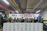 어웨이크뉴스 오경하 기자 | 파주시 파주읍 새마을부녀회와 새마을지도자협의회는 지난 11일, 겨울을 앞두고 지역 내 어려운 이웃을 위한 ‘사랑의 김장김치 나눔 행사’를 실천했다고 밝혔다. 이날 행사는 새마을부녀회원들과 지도자협의회원들이 이틀에 걸쳐 협력해 진행됐다. 전날인 10일에는 배추 절이기와 재료 손질 등 사전 준비를 진행했으며, 11일에는 본격적으로 속 넣기와 포장 작업을 이어가며 정성껏 김치를 담갔다. 완성된 김장김치 119상자는 새마을부녀회원이 관내 저소득 독거 어르신 가정에 직접 방문하며 전달해 따뜻한 정성을 전했다. 이선희 파주읍 새마을부녀회장은 “회원들과 함께 마음을 모아 담근 김치가 이웃들에게 힘이 되길 바란다”라며 “앞으로도 여성의 섬세한 손길로 지역 나눔을 실천하겠다”라고 전했다. 변봉수 파주읍 새마을지도자협의회장은 “지역사회가 함께 나누고 배려할 때 더 따뜻해진다”라며 “작은 정성이지만 이웃들에게 힘이 되길 바란다”라고 말했다. 윤상기 파주읍장은 “매년 이어지는 김장김치 나눔 행사는 지역 공동체의 온정을 느낄 수 있는 소중한 자리”라며 “앞으로도 민관이 협력해 복지