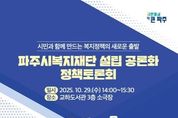 어웨이크뉴스 오경하 기자 | 파주시는 오는 29일 14시, 교하도서관 3층 소극장에서 ‘파주시복지재단 설립 공론화 정책토론회’를 개최한다고 밝혔다. 이번 토론회는 파주시복지재단 설립을 앞두고 시민, 전문가, 현장 종사자의 다양한 의견을 수렴해 재단 설립의 필요성과 발전 방향을 함께 모색하기 위해 마련됐다. 토론회는 김민철 서영대학교 사회복지행정학과 교수의 기조 강연을 시작으로, 파주시 복지기획팀장의 주제 발표가 이어진다. 이어 한지원 두원공과대학교 교수가 좌장을 맡아 토론을 진행하며, 이보경 파주시문산종합사회복지관 관장, 오민수 경기복지재단 선임연구위원, 박윤근 화성시복지재단 사업본부장 등이 참석해 열띤 논의를 펼칠 예정이다. 토론에서는 ▲파주시복지재단 설립의 필요성과 추진 개요 ▲파주시 여건을 반영한 복지재단의 발전 방향 ▲재정 자립 및 지속가능성 확보 방안 등 다양한 주제가 심도 있게 논의될 예정이다. 김은숙 복지정책국장은 “파주시복지재단은 시민의 삶을 보다 세밀하게 지원하고, 지역 현장의 목소리를 반영한 ‘파주형 복지모델’을 실행할 구심점이 될 것”이라며, “이번 토론회를 통해 파주시 복지 정