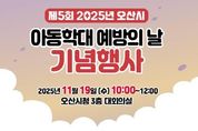 어웨이크뉴스 오경하 기자 | 오산시는 오는 19일 ‘아동학대예방의 날’과 ‘아동학대예방주간’을 맞아 기념행사 및 온·오프라인 캠페인을 실시한다고 12일 밝혔다. 행사는 19일 오전 10시부터 12시까지 오산시청 대회의실에서 진행되며, ▲1부 아동학대예방의 날 기념식 식전공연, 유공자 표창 시상, 퍼포먼스, ▲2부 부모교육 특별강연으로 구성된다. 특별강연은 리플러스 인간연구소 박재연 소장이 ‘부모를 위한 건강한 대화방법’을 주제로 진행한다. 매년 11월 19일은 아동학대 예방과 방지에 대한 사회적 관심을 높이기 위해 제정된 법정기념일로, 오산시는 매년 기념식과 강연, 캠페인 등을 통해 아동학대 예방의 중요성을 알리는 다양한 활동을 추진해오고 있다. 시는 이달 25일까지 온라인 릴레이 캠페인도 함께 진행한다. 오산시민 누구나 SNS에 아동학대예방 메시지 또는 관련 사진을 업로드해 참여할 수 있다. 또한 11월 24일에는 시청 인근 주요 교차로에서 시민 대상 오프라인 홍보 캠페인을 실시해 아동학대 예방 인식 제고에 나설 예정이다. 박현주 아동복지과장은 “이번 행사가 아동학대 예방의 중요성을 되새기고 아이