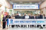 어웨이크뉴스 오경하 기자 | 수원특례시와 봉화군농어업회의소는 19일 수원시청에서 로컬푸드 입점 협약을 체결했다. 협약식은 이날 시청 별관 앞에서 열린 ‘봉화 수원 캠핑장 개장 기념 농산물 직거래장터’에서 진행됐다. 수원시는 인구소멸 위기 지역 농가의 안정적 판로 확보를 지원하고, 시민에게 신선한 지역 농산물을 제공할 예정이다. 협약식에는 남상은 수원시 농업기술센터 소장, 김주익 봉화군농어업회의소 회장, 신종길 봉화군 농업기술센터 소장 등이 참석했다. 봉화 수원 캠핑장 개장 기념 농산물 직거래장터에는 수원시·봉화군·수원농협·하나로마트 수원점이 참여했다. 수원로컬푸드직매장은 상추·배추·표고버섯 등 농산물을, 봉화군은 사과·생강·고구마·마 등 주요 특산물을 판매했다. 하나로마트 수원점은 감, 인삼, 대추, 새우젓, 멸치 등 통영·사천·김천 등의 농산물을 판매했다. 방문객에게 정다미 500g 200개와 장바구니 200개를 제공하는 행사도 진행했다. 수원시 관계자는 “수원시민에게 신선한 로컬푸드를 제공하고, 인구소멸 위기 지역 농가와 상생 협력할 수 있는 기반을 마련했다”며 “지역 농가와 시민