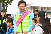 어웨이크뉴스 오경하 기자 | 이상일 용인특례시장은 14일 아침 처인구 고림로에 위치한 고진초등학교 정문 횡단보도에서 어린이들의 안전한 통학환경 조성을 위한 교통지도 봉사활동에 참여하고 학교 주변 통학로를 점검했다. 이상일 시장은 서경란 고진초 교장, 녹색어머니회·학부모회·학생 등 60여명과 함께 등굣길 어린이들이 안전하게 길을 건널 수 있도록 돕고 운전자들에게 ‘어린이보호구역 내 서행’을 당부하는 교통안전 캠페인을 펼쳤다. 이 시장은 통학로 현장을 둘러보며 ▲고림고 유리방음벽 모서리 보호대 설치 ▲고림고~힐스테이트용인고진역 구간 횡단보도 너비 확대 ▲해당 구간 도로의 물고임 등 도로시설물 일제정비 ▲통학로 낙엽제거(보행자 미끄러짐 방지) 등의 추가 건의사항을 꼼꼼히 챙겼다. 이상일 시장은 녹색어머니회와 학부모회 회원들에게 “아이들의 등굣길을 지켜주셔서 감사 드린다”며 “학생들이 마음 놓고 통학할 수 있는 안전한 도시 환경을 만드는 것이 무엇보다 중요한 만큼 시에서도 현장을 잘 살펴 필요한 조치를 신속히 진행하겠다”고 말했다. 이 시장은 10월과 11월에도 용인신촌초, 백현초, 구갈초, 신월초, 함박